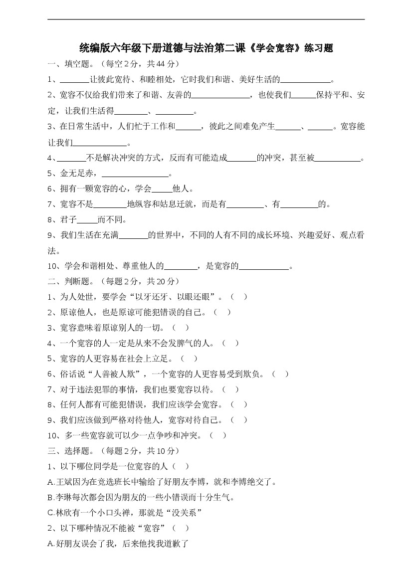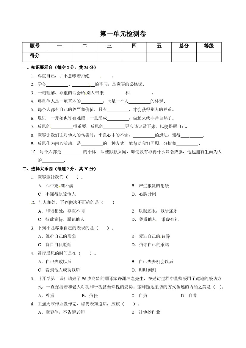 人教部编版六年级下册《道德与法治》第1课《学会尊重》课课练(含答案)