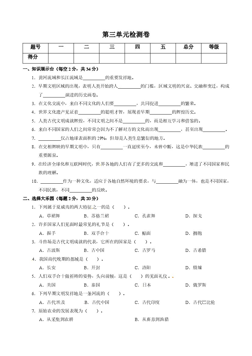 六年级下册道德与法治单元测试-第三单元多样文明多彩生活(2)人教部编版(含答案)