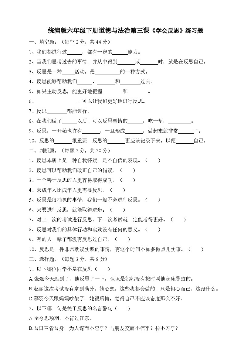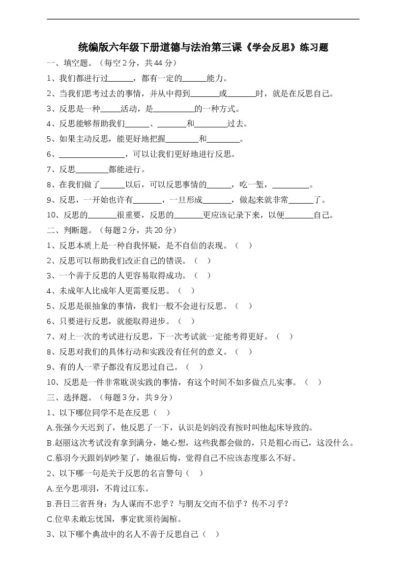 人教部编版六年级下册《道德与法治》第3课《学会反思》课课练(含答案)