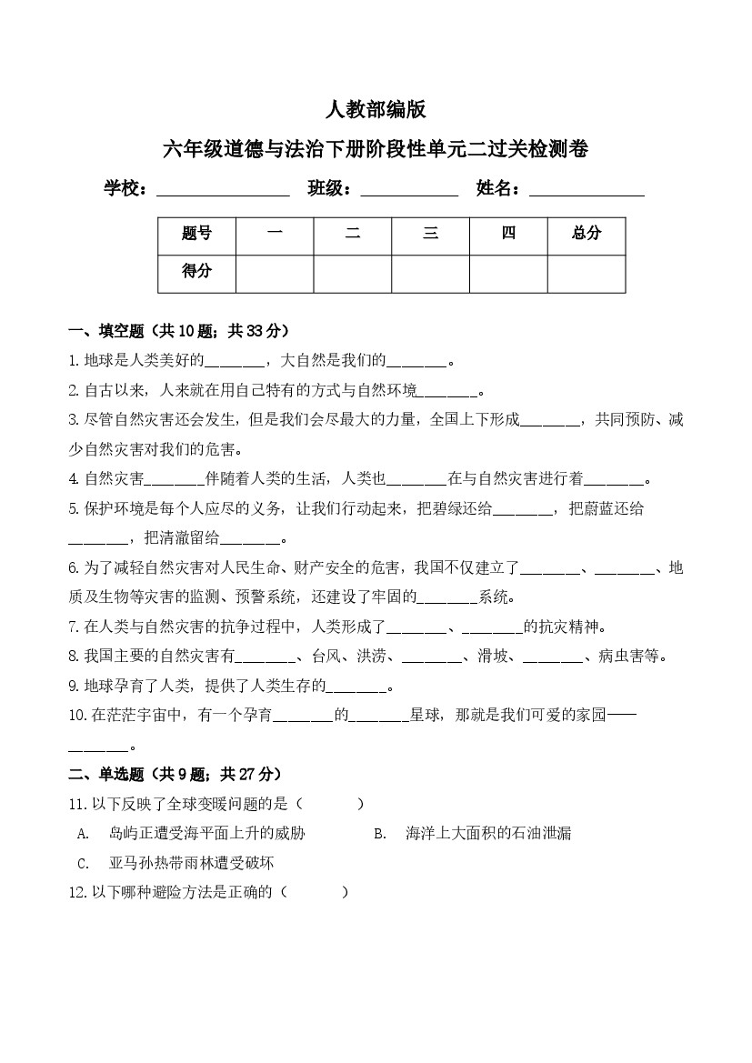 六年级下册道德与法治单元测试-第二单元爱护地球共同责任(3)人教部编版(含答案)