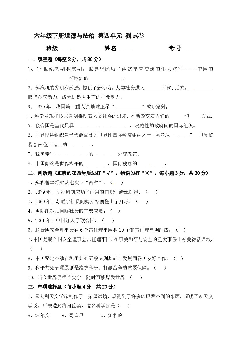 六年级下册道德与法治单元测试-第四单元让世界更美好(1)人教部编版(含答案)