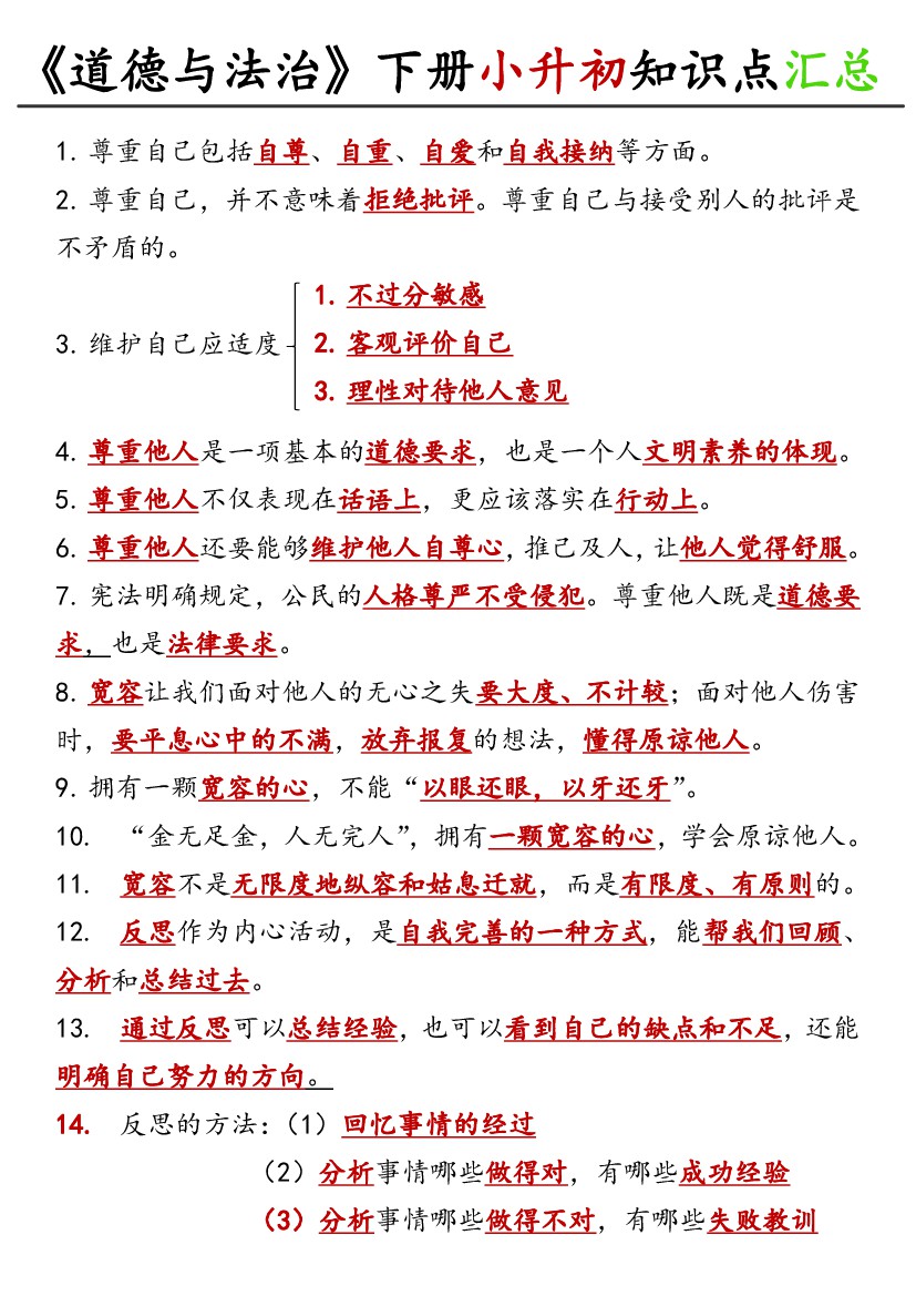 《六年级《道德与法治》下册小升初知识点汇总》六下道法
