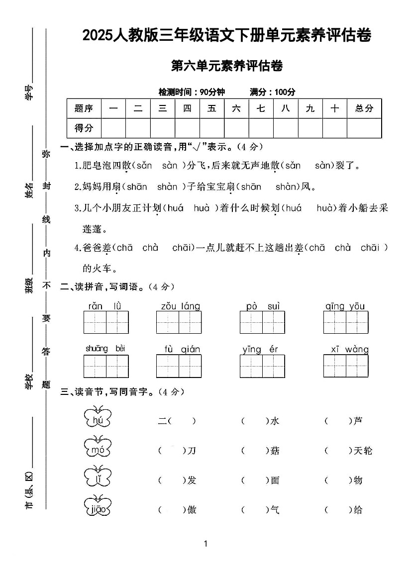三年级(下)语文第六单元素养评估卷(含答案8页)