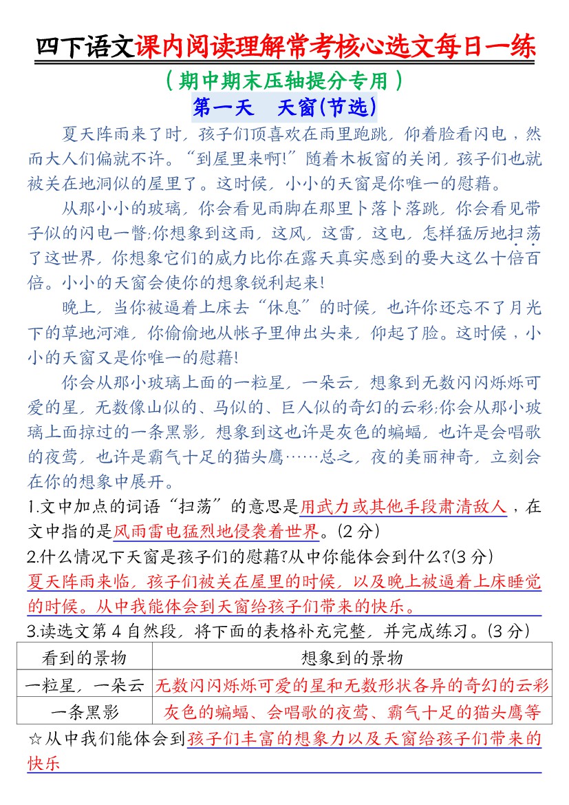 【1-4单元阅读方法及阅读题目(答案版)】四下语文