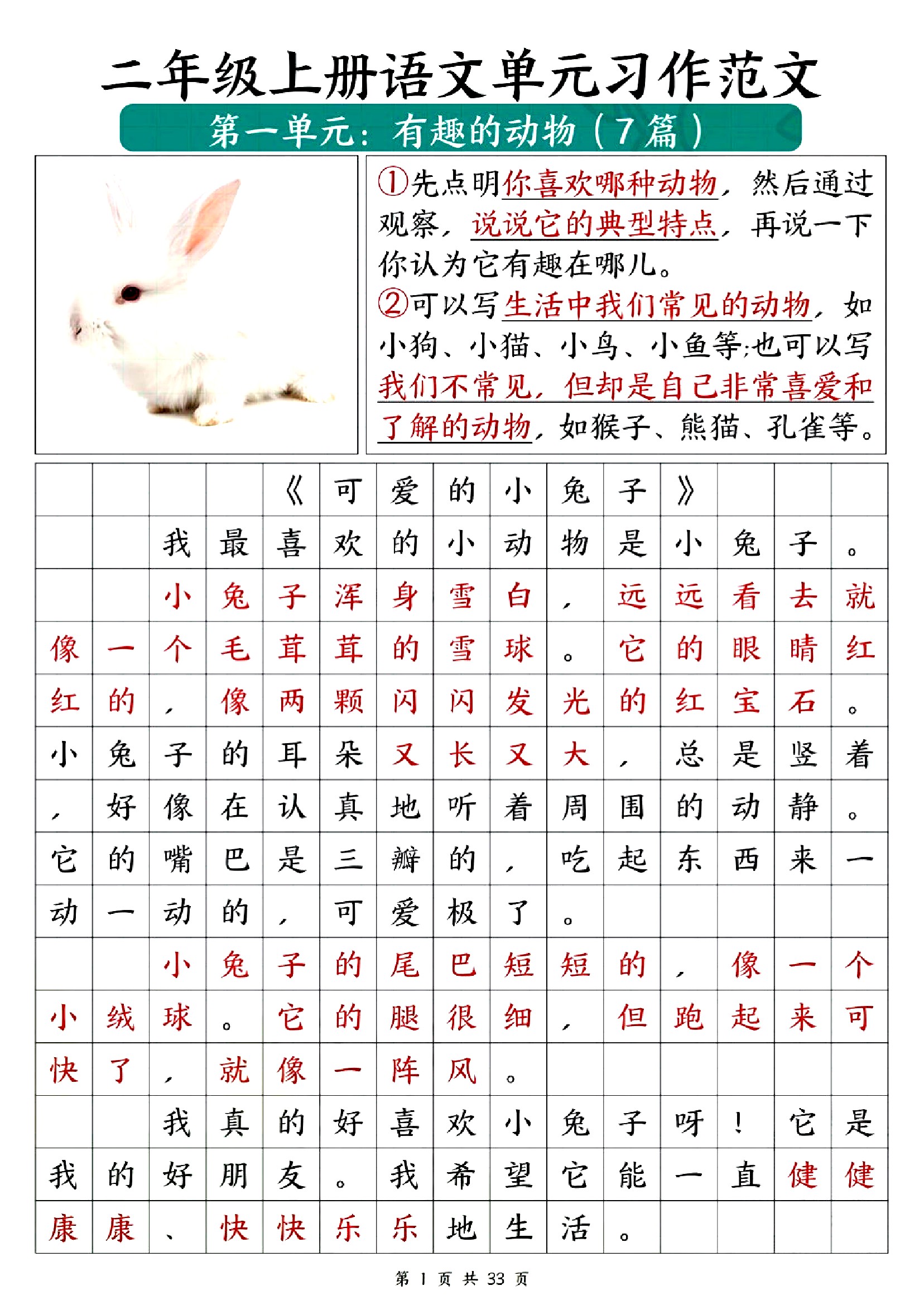 小学 二上语文1-8单元必备优秀写作范文33篇(33页)