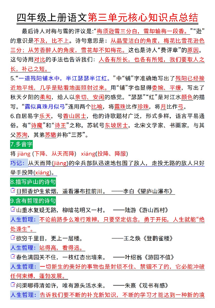 小学 四年级上册语文第三单元核心知识点梳理总结