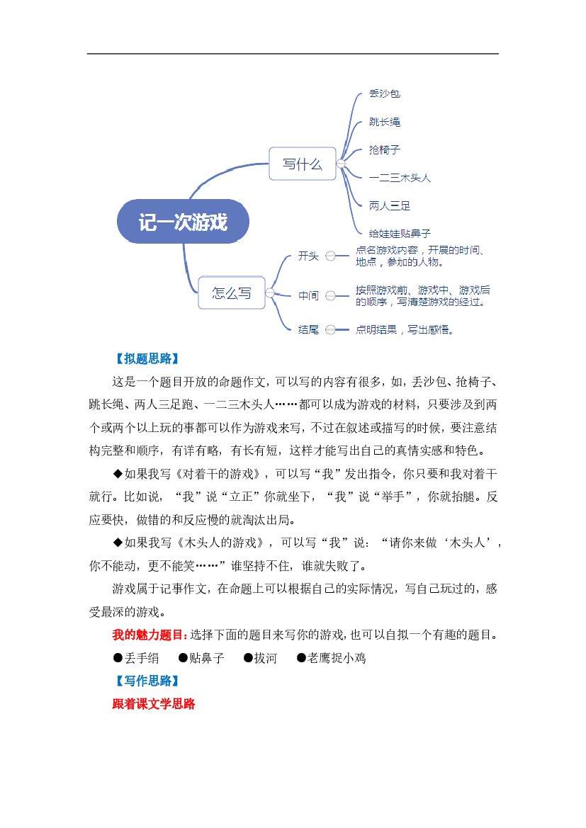 小学 人教部编版四年级语文上册第6单元同步作文:记一次游戏 写作指导+范文赏析+病文升格(学生版)-部编版语文四年级上册