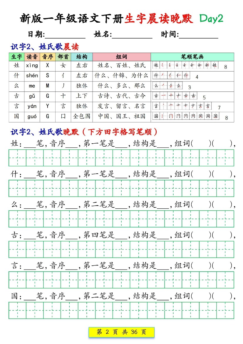 小学 一下语文生字晨读晚默36天