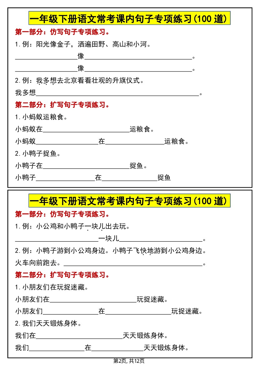 小学 【句子】一下语文常考课内句子专项练100道(12页)