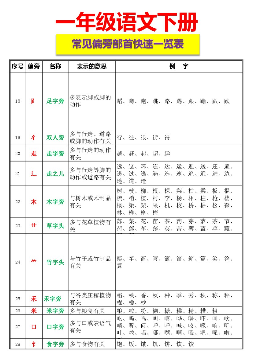 【部首】一年级(下册)资料整理-常见偏旁部首一览表4页