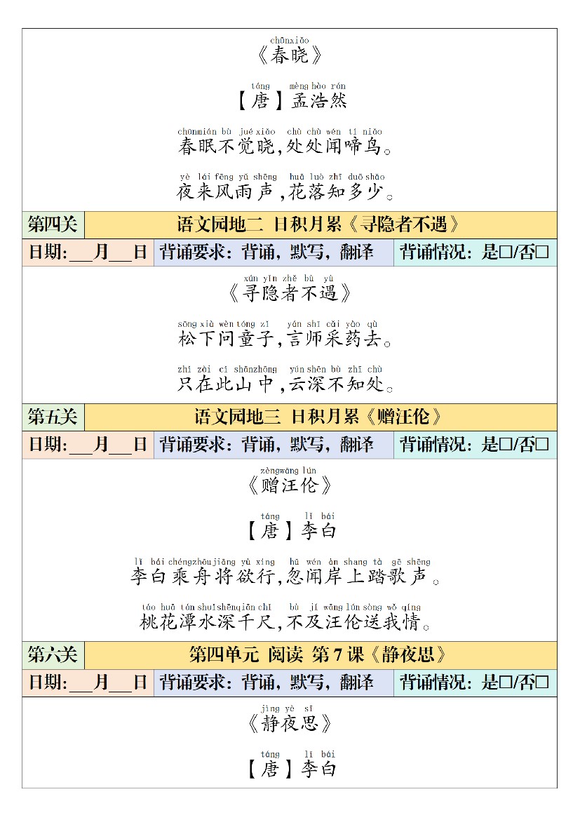 小学 一下【语文】寒假预习【课内背诵闯关表】(6页)