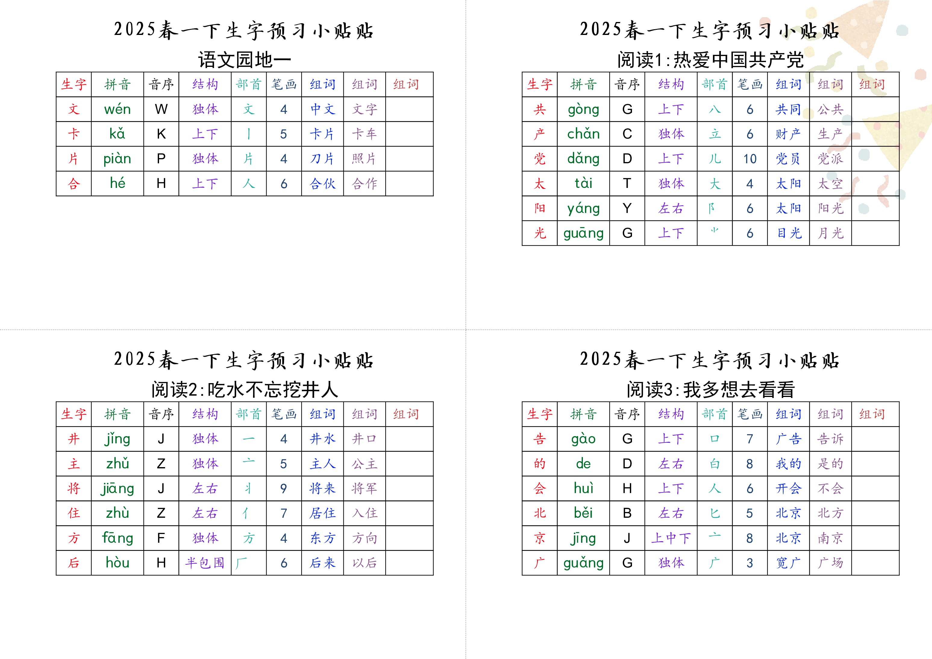 小学 【生字小贴贴】一下语文最终版生字预习