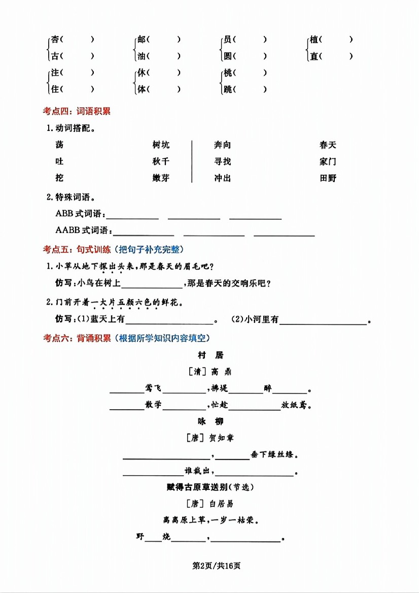 二年级(下)语文单元考点摸查练习
