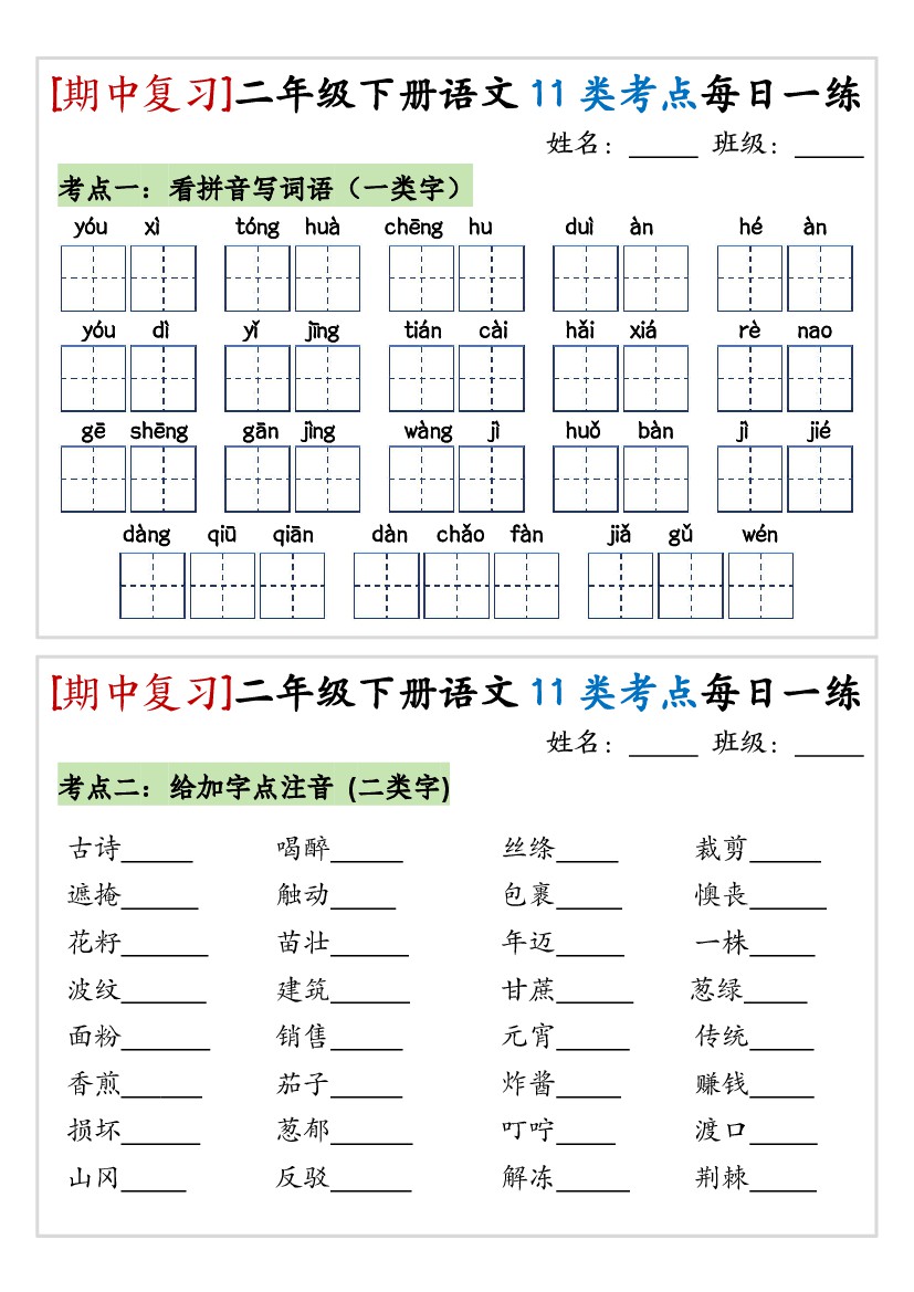 小学 二下语文期中复习11类考点每日一练