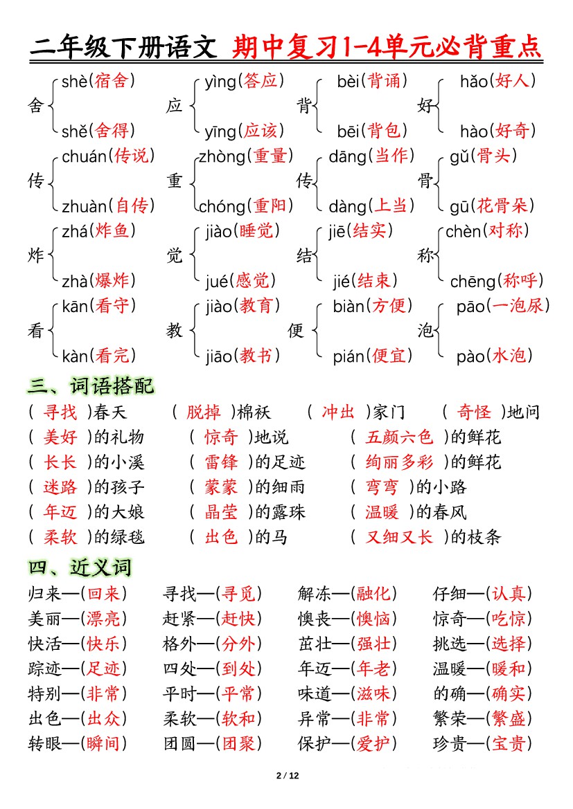 小学 【期中复习1-4单元常考必背重点】二下语文