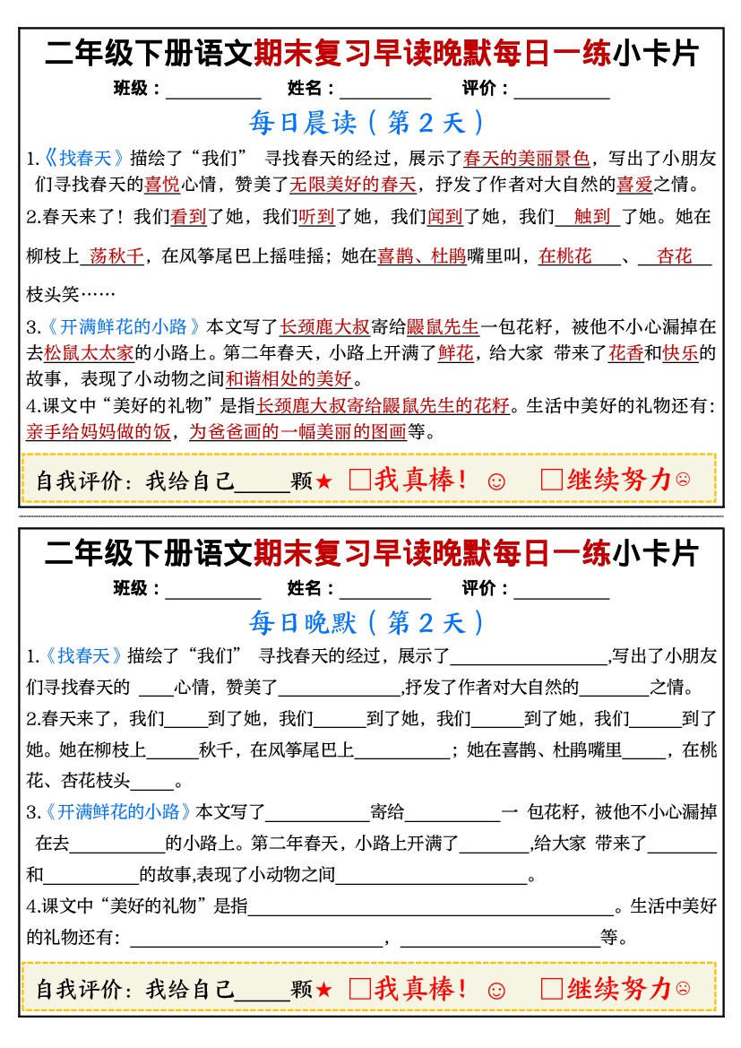 二年级(下)语文期末复习早读晚默每日一练小卡片