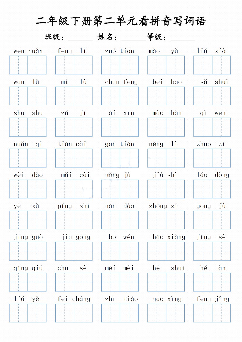 首页 > 全部 > 专项练习 > 二年级下册看拼音写词语(全册)