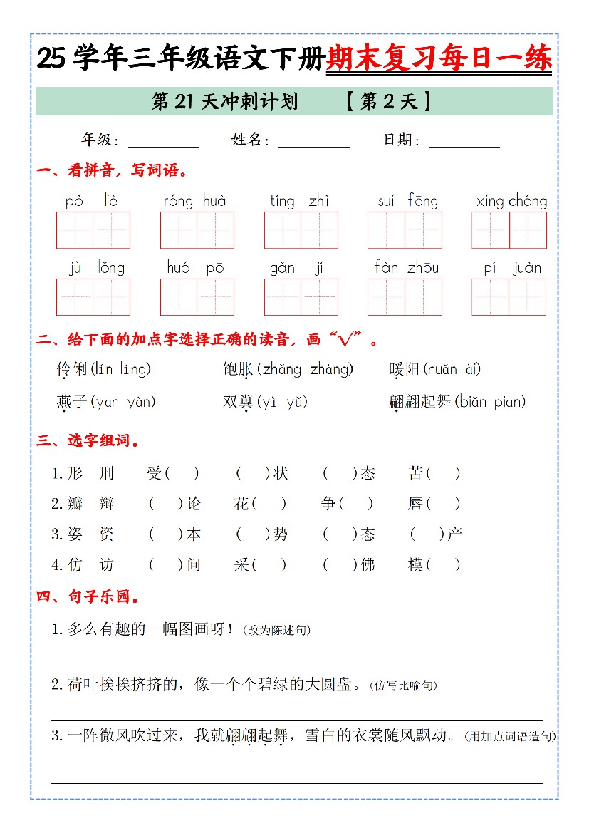 小学 25学年三年级语文下册期末复习每日一练21天冲刺(偶尔)-m