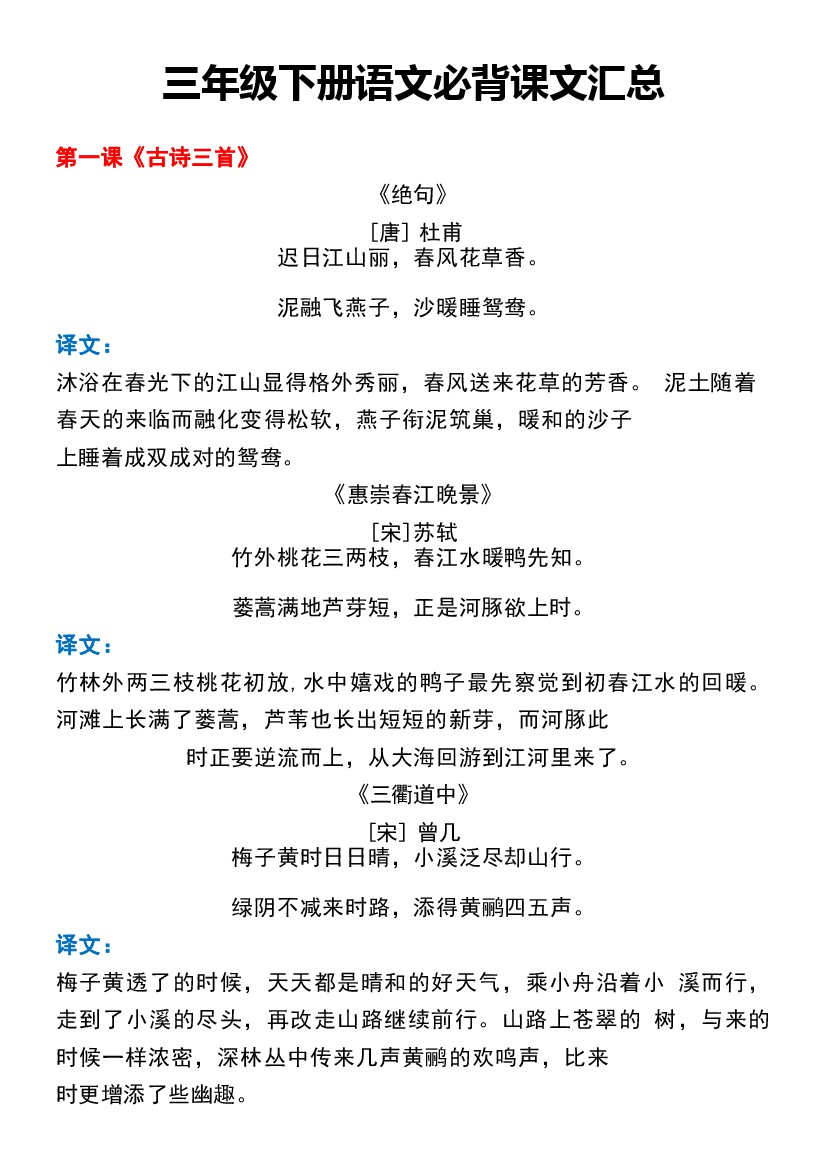 小学 三下语文必备背诵默写闯关表