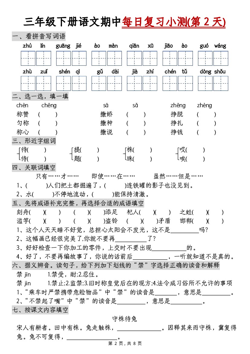 小学 三下语文期中每日复习小测(含答案8页)
