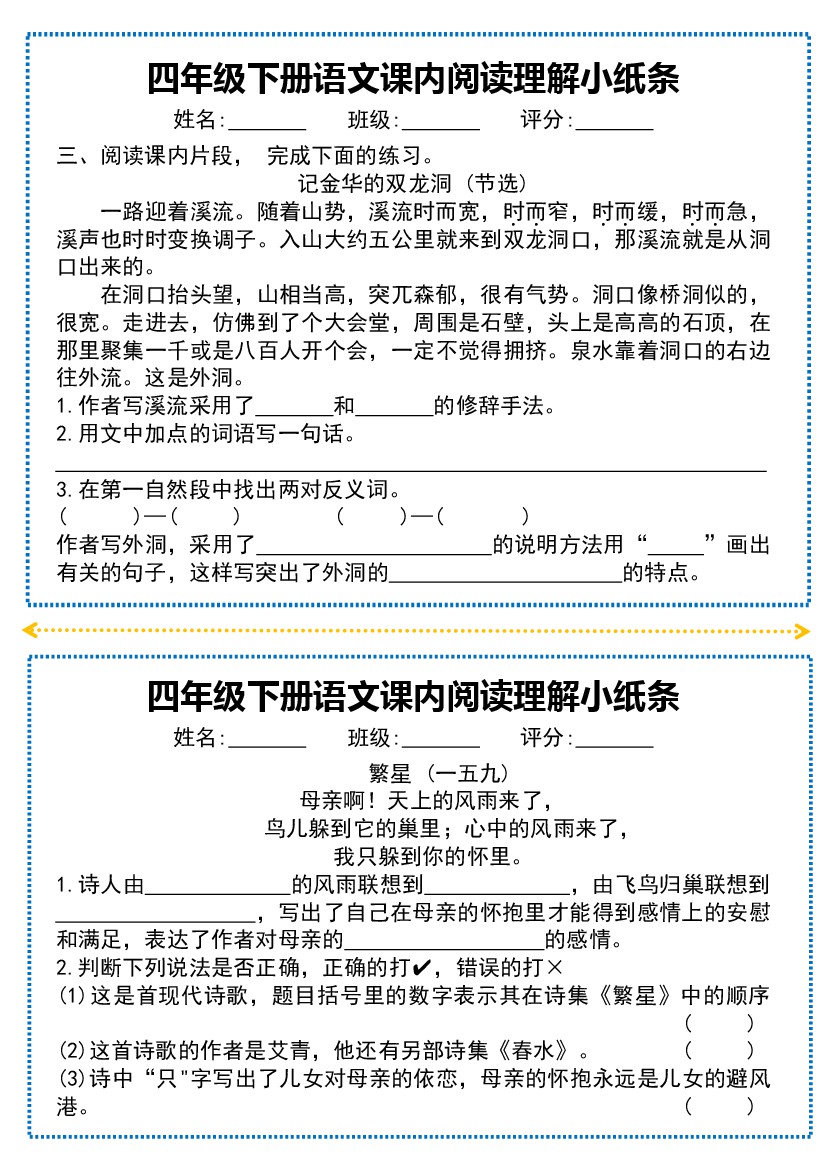 小学 【课内阅读理解小纸条】四下语文