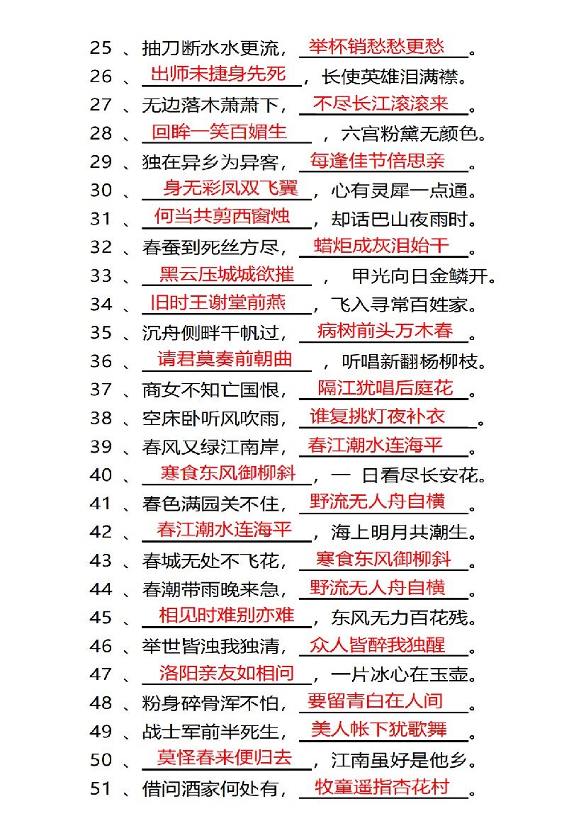 四年级(下)语文常考古诗词填空100题有答案