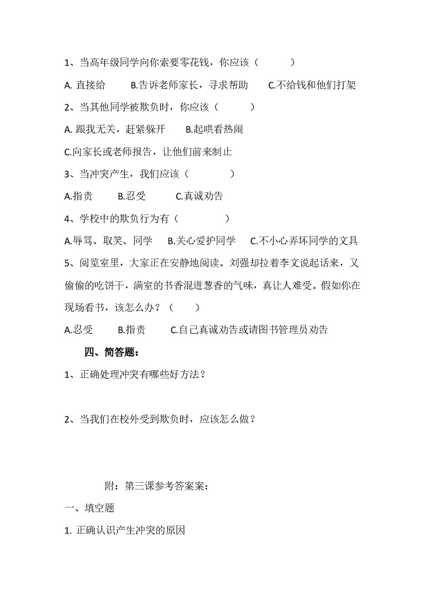 小学 人教部编版四年级下册《道德与法治》第3课当冲突发生课课练