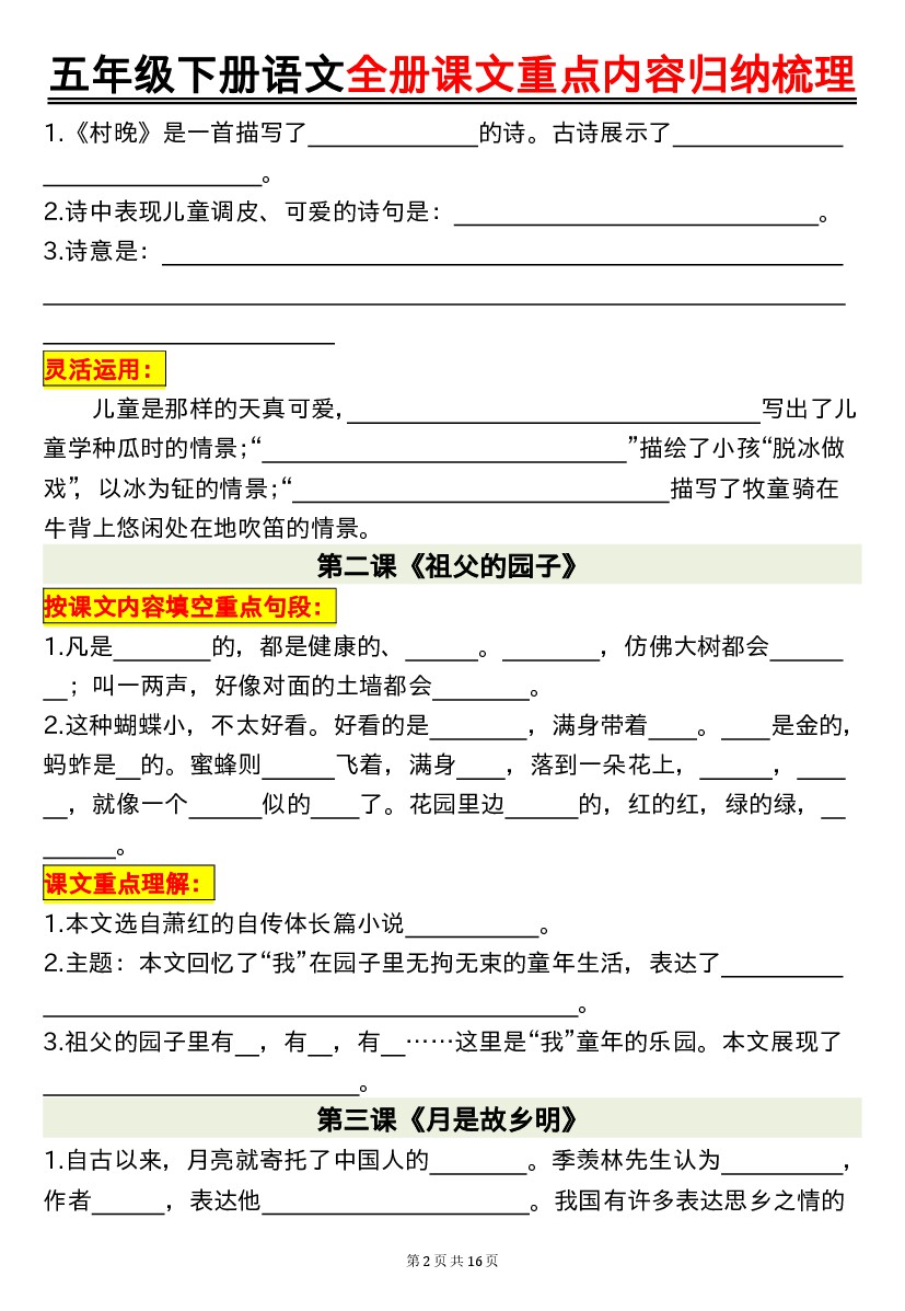 小学 五年级下册语文全册课文重点内容归纳梳理空白