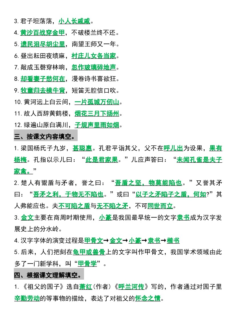 五年级(下)语文常考课文重点内容填空