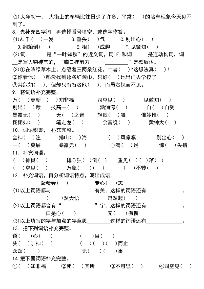 首页 > 全部 > 专项练习 > 六年级(下)语文小升初专项复习—四字词语(成语)填空