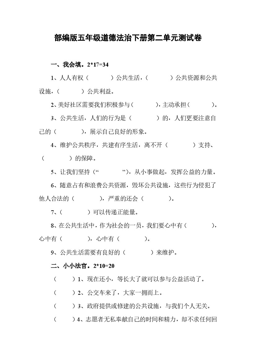 人教部编版道德与法治五年级下册第二单元测试题含答案