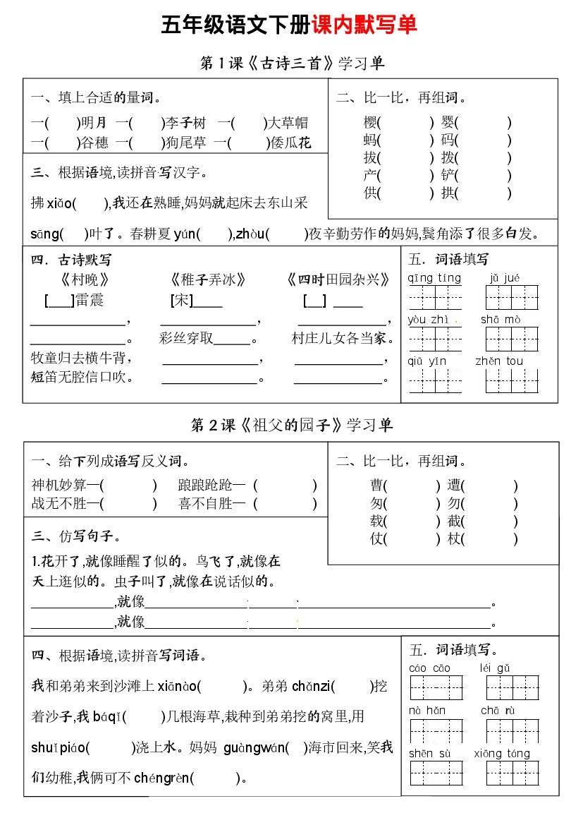 五下语文课内默写单1-14课(10页无答案)