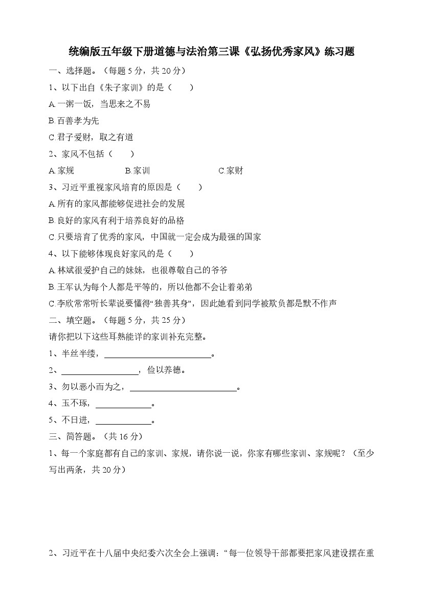 五下道法第三课《弘扬优秀家风》练习题