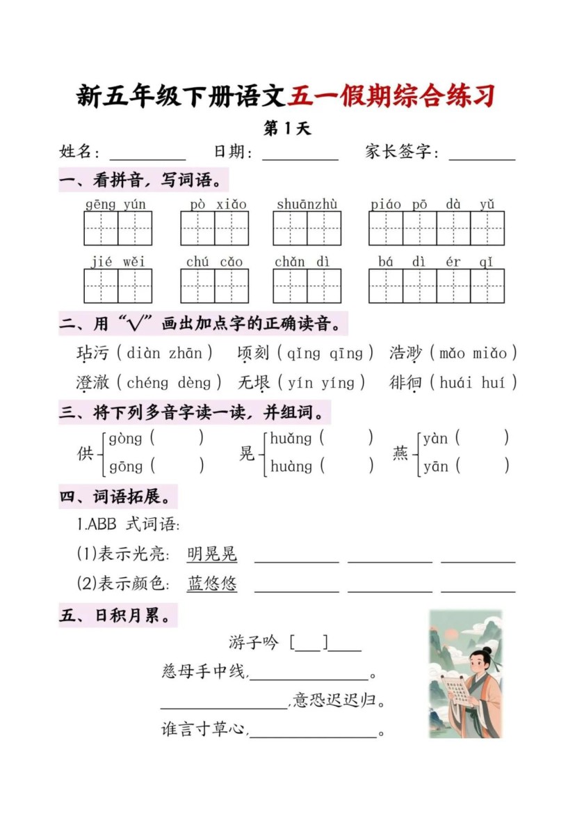 新五年级语文下册五一假期作业(5天5页)